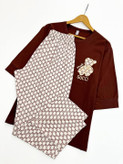 جنس تیشرت :سوپر پنبه جنس شلوار پنبه لاکرا (زانو نمیندازه) رنگبندی طبق اسلاید (مشکی،کرم،قهوه ای) قواره دار مناسب ۴۶/۴۸ مشخصات: تیشرت:عرض ۵۴ قد ۷۱ آستین ۵۲ مچی شلوار:عرض ران ۳۳ قد ۱۰۰ مرغکدار